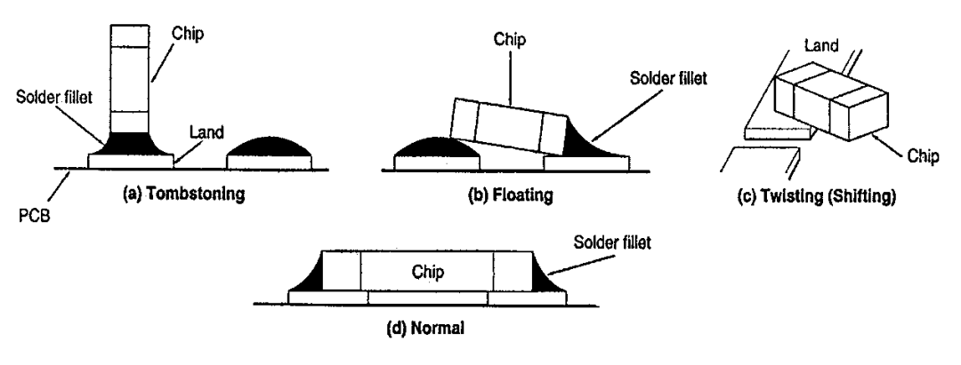 原因:本身两端电极尺寸差异较大;锡镀层不均匀;PCB板焊盘大小不等、有污物或水分、氧化以及焊盘有埋孔;锡膏粘度过高,锡粉氧化。