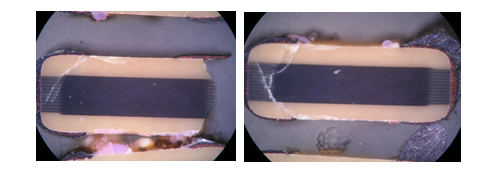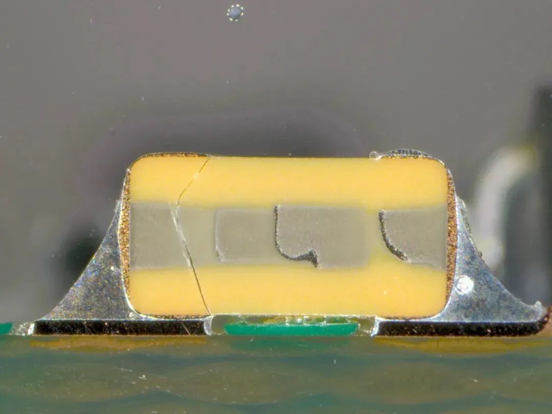 电容在受到过强热应力冲击时,产生的裂纹无固定形态,可分布在不同的切面,严重时会导致在电容侧面形成水平裂纹。