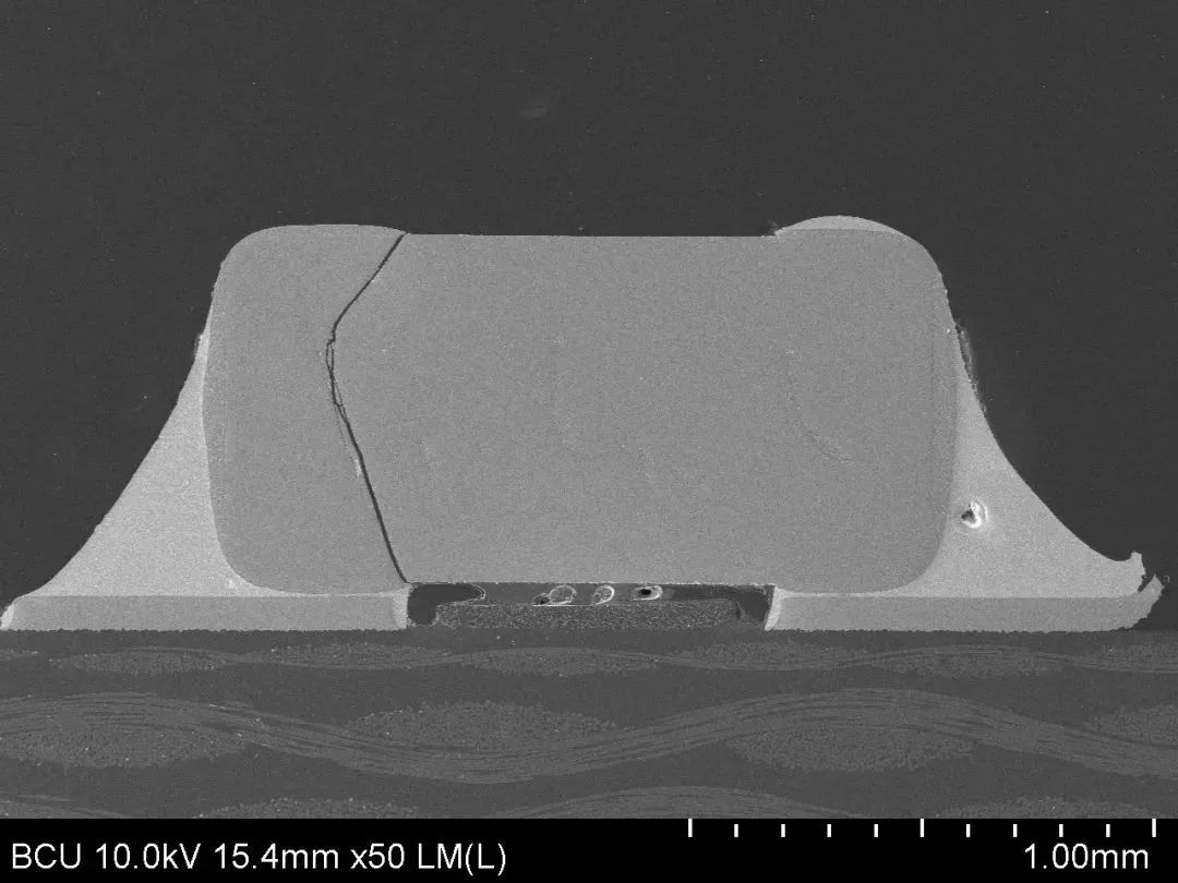 对电容进行金相切片处理,可以清楚地看出,电容内部裂纹起源于焊端附近,呈Y字型,这是典型的机械应力裂纹形貌,对照可能的应力源排查,规范操作过程,最终解决电容开裂问题。
