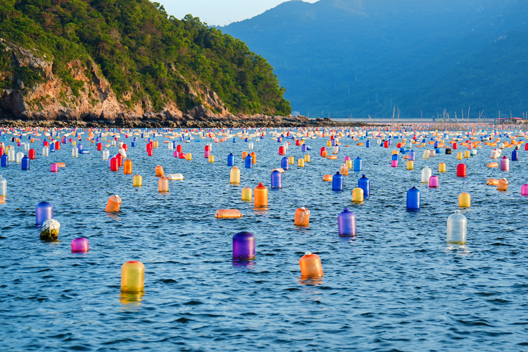 迎着清爽的海风,我们启航驶入如画的西线海域。这里碧波万顷,天光云影共徘徊,最令人惊叹的是色彩斑斓的生态环保浮球方阵在朝阳映照下形成一片“彩虹海”——整齐排列的浮球在阳光下闪烁,宛如一串串彩珠缀于蔚蓝绸缎,勾勒出独特的海洋诗画。